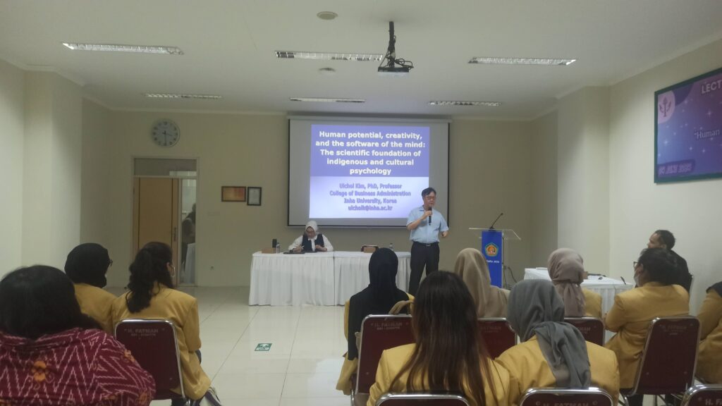 Dalam sesi utama, Prof. Kim memaparkan pandangannya mengenai pentingnya memahami nilai-nilai budaya lokal dalam praktik psikologi modern. Ia menjelaskan bahwa indigenous psychology membantu para profesional memahami perilaku manusia dalam konteks budaya yang spesifik, sehingga pendekatan intervensi menjadi lebih relevan dan efektif.