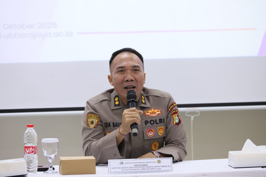 Bekasi, 27 Oktober 2025 – Dalam rangka menguatkan pemahaman mengenai peran Psikologi di Kepolisian serta merespon pada Program Polda Goes to Campus, Fakultas Psikologi Universitas Bhayangkara Jakarta Raya (Ubhara Jaya) menyelenggarakan kegiatan Kuliah Umum bertema “Penerapan Psikologi di Kepolisian” yang berlangsung secara hybrid secara offline diRuang Wilmar 103, Gedung Grha Tanoto, Kampus II Bekasi, serta melalui Zoom Meeting.
